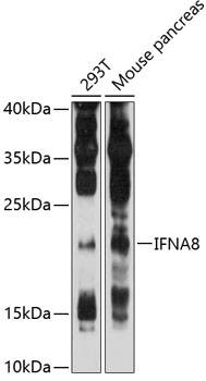 Western blot analysis of extracts of various cell lines, using IFNA8 antibody. |