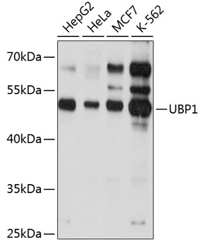 Western blot analysis of extracts of various cell lines, using UBP1 antibody. |