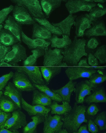 Immunofluorescence analysis of U-2 OS cells using EIF3G Polyclonal Antibody. |