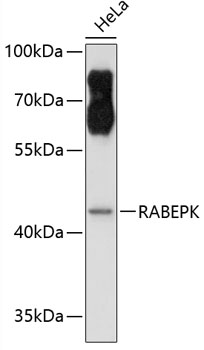 Western blot analysis of extracts of HeLa cells, using RABEPK antibody. |