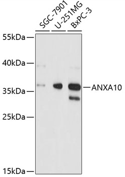Western blot analysis of extracts of various cell lines, using ANXA10 antibody. |