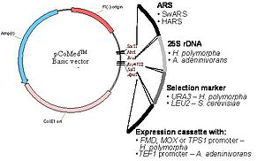In order to produce a desired product, suitable yeast strains are transformed with a vector that contains all necessary genetic elements for the production of a biological product of interest. Vectors must also contain a selection marker, which is required to select yeast which has successfully taken up the vector from those which have not. Vectors also contain certain DNA elements allowing the yeast to incorporate the foreign DNA into the chromosome of the yeast and to replicate it. Most importantly, vectors contain a segment responsible for the production of the desired compound, called an expression cassette. The cassette contains a sequence of regulatory elements that control how much and under which circumstances a certain product is eventually made. This is followed by the gene for the biological product itself. The expression cassette is terminated by a terminator sequence that stops the transcription of the expressed gene.