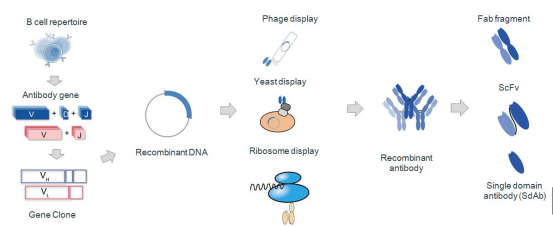 Step 3: Choose appropriate antibody display technology, such as phage display (which can screening small antibody fragment to obtain large antibody library); ribosome display (which can get a library of a capacity of 1014 without limitation of transformation efficiency and acquire mutant antibody library); yeast display (which make human antibody expression more superior because that yeast expression system is similar with mammalian cells). According to these above procedures, some recombinant antibodies can be constructed successfully, such as scfv antibody fragments, fab antibody fragments, and single domain antibodies.