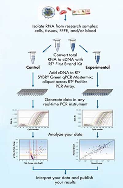 PCR array is also called functional classification chip. It combines the advantages of sensitivity and reliability of Real-time quantitative PCR and multiple genes expression level detection simultaneously of Microarray. It’s the first choice to analyze signal pathways or certain biological functions related genes expression status. PCR array is based on the method of fluorescence quantitative PCR and all primers are tested. It has advantages of simple principles, reliable results and good compatibility. The change of a certain disease, signal pathway or biological function related 84 or 372 important genes expression level could be detected quantitatively on a 96-well or 384-well plate simultaneously(others are comparison sample wells). PCR array could analyze a certain disease, signal pathway or biological process related genes expression quantitatively at one time.