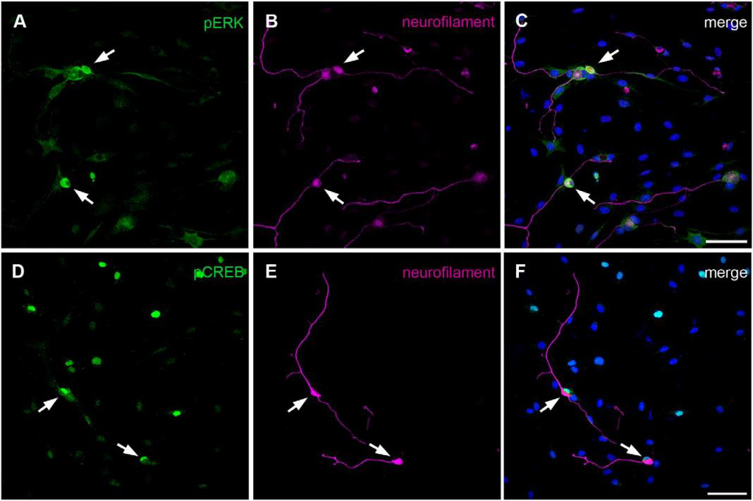 F1. Projections of collapsed confocal scans showed double-stainings with pERK (A) or pCREB (D) antibodies and antibodies directed against neuron-specific 200 kDa neurofilament (B, E) in spiral ganglion cell cultures pre-treated with BDNF (47 h, 30 min) and exposed to Rolipram for 30 min.Recommended concentration is 1:100,000, using our standard fixation and staining procedure.