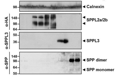 F1. The C-terminally truncated NRG1 type III NTF’ is endoproteolytic by SPPL2a and SPPL2b but not by SPP and SPPL3. HEK293 cells or HEK293 cells stably expressing HA tagged wild-type or catalytically inactive mutants (DA) of SPPL2a, SPPL2b, SPP, or SPPL3 were transiently transfected with N-terminally V5 tagged NRG1 type III (V5-NRG1 type III). Isolated membranes were subjected to Western blot analysis for protease expression control. Calnexin was used as a loading control.