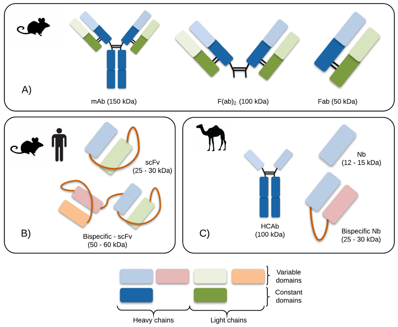 Fig.1 The size of different types of antibody fragments and their common hosts