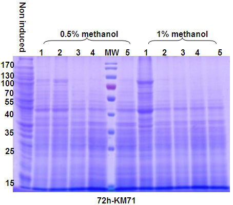 Result analysis: From SDS-PAGE result, the expressions of target protein (40KDa after glycosylation) were observed, GS115-5#-24h, 0.5% methanol, GS115-2#-48h, 1% methanol, GS115-3#-48h, 1% methanol, KM71-1#-72h,1% methanol, each group could show significant band, indicate the target protein is successfully expressed.