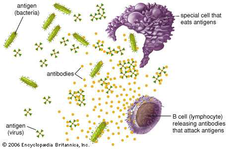 As antibodies circulate, they attack and neutralize antigens that are identical to the one that triggered the immune response. Antibodies attack antigens by binding to them. The binding of an antibody to a toxin, for example, can neutralize the poison simply by changing its chemical composition; such antibodies are called antitoxins. By attaching themselves to some invading microbes, other antibodies can render such microorganisms immobile or prevent them from penetrating body cells. In other cases the antibody-coated antigen is subject to a chemical chain reaction with complement, which is a series of proteins found in the blood. The complement reaction either can trigger the lysis (bursting) of the invading microbe or can attract microbe-killing scavenger cells that ingest, or phagocytose, the invader. Once begun, antibody production continues for several days until all antigen molecules are removed. Antibodies remain in circulation for several months, providing extended immunity against that particular antigen.