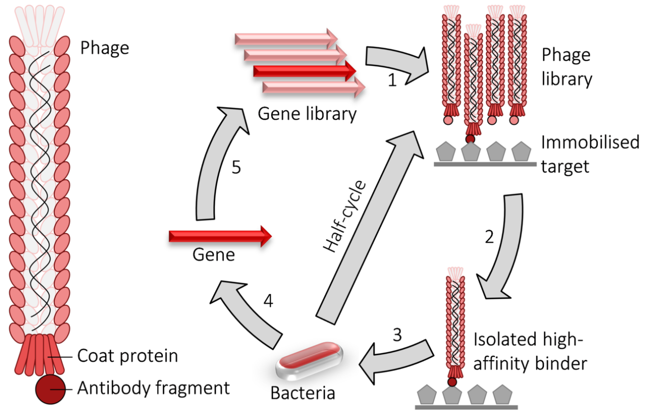 1) fusion proteins for a viral coat protein + the gene to be evolved (typically an antibody fragment) are expressed in bacteriophage.