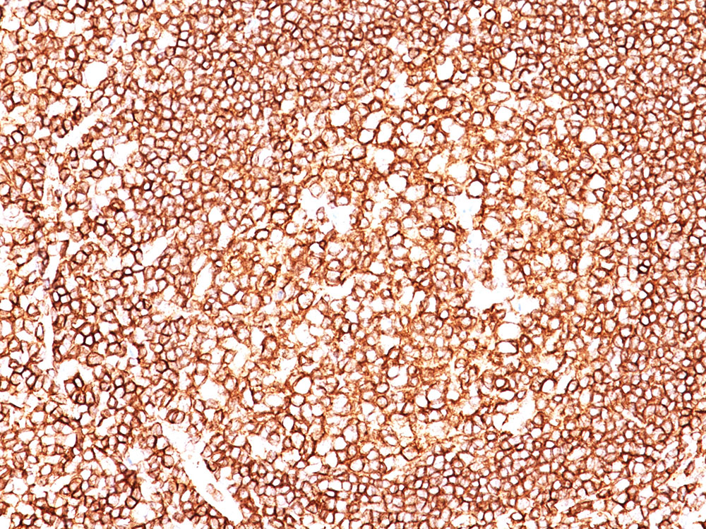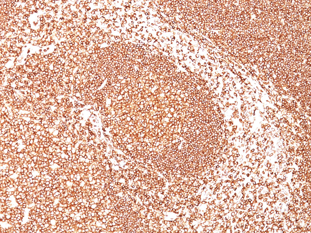Recognizes the CD45 leukocyte common antigen (LCA) family which is comprised of at least four isoforms of membrane glycoproteins (220, 205, 190, 180kDa) expressed on hematopoietic cell lines but absent on non-hematopoietic cell lines, normal and malignant non-hematopoietic tissues. The intracellular portions of these molecules have protein phosphatase activity and are involved in regulation of transmembrane signals. Antibody to CD45 is useful in differential diagnosis of lymphoid tumors from non-hematopoietic undifferentiated neoplasms. A positive result with this MAb is highly indicative of lymphoid or myeloid origin. Certain types of lymphoid neoplasms may lack CD45 (Hodgkin lymphoma, some T-cell lymphomas, and some leukemias) so its absence does not rule out a hematolymphoid tumor. This antibody is expressed almost exclusively by cells of hematopoietic lineage and is present in most benign and malignant lymphocytes as well as plasma cell precursors.