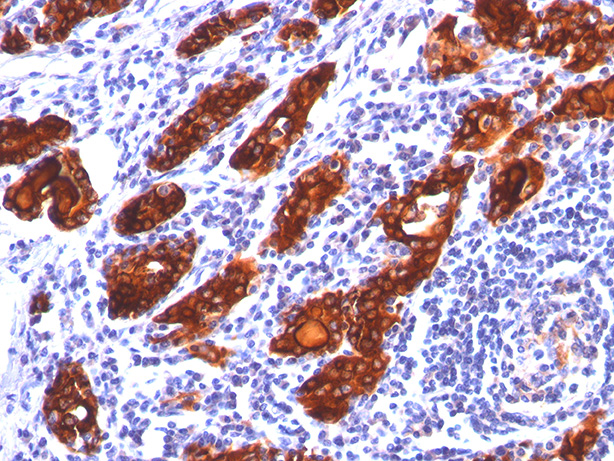 Thyroglobulin is a 660kDa dimeric pre-protein with mutiple glycosylation sites. It is produced by and processed within the thyroid gland to produce the hormone thyroxine and triiodothyronine. Prior to forming dimers, thyroglobulin monomers undergo conformational maturation in the endoplasmic reticulation. The vast majority of follicular carcinomas of the thyroid will give positive immunoreactivity for anti-thyroglobulin even though sometimes only focally. Poorly differentiated carcinomas of the thyroid are frequently anti-thyroglobulin negative. Adenocarcinomas of other-than-thyroid origin do not react with this antibody. This antibody is useful in identification of thyroid carcinoma of the papillary and follicular types. Presence of thyroglobulin in metastatic lesions establishes the thyroid origin of tumor. Anti-thyroglobulin, combined with anti-calcitonin, can identify medullary carcinomas of the thyroid. Furthermore, anti-thyroglobulin, combined with anti-TTF1, can be a reliable marker to differentiate between primary thyroid and lung neoplasms.