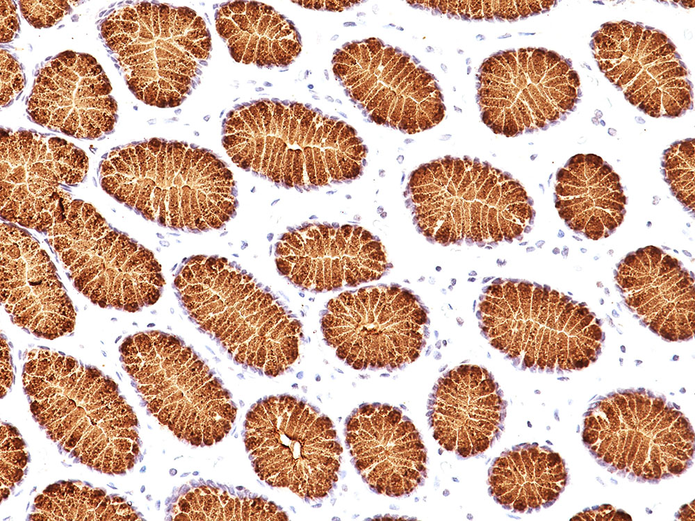 This MAb recognizes the peptide core of gastric mucin M1 (>1,000kDa) (recently identified as Mucin 5AC). Its epitope is destroyed by beta-mercaptoethanol and proteases but not by periodate treatment. Antibody to gastric mucin M1 reacts with the gastric epithelium of normal human gastrointestinal tract as well as with the precancerous and cancerous colon but not with normal adult colon. It also reacts with fetal colonic mucosa. Resurgence of gastric mucin reactivity during colonic carcinogenesis is due to re-expression of the peptide core of gastric (or fetal colonic) mucins.