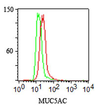 Intracellular flow cytometry of fixed (70% ethanol or 80% methanol) and permeabilized A549 cells using MUC5AC Ab (45M1) (red) and isotype control (green). |