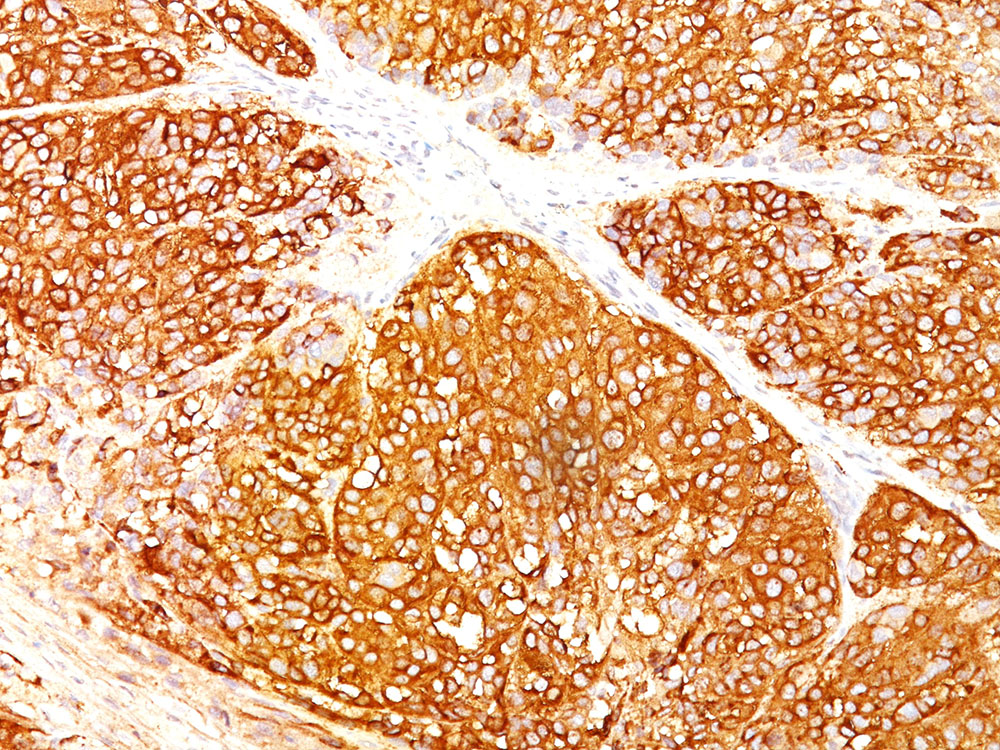Formalin-fixed, paraffin-embedded human melanoma stained with Melanoma Marker MAb (A103 + T311 + HMB45). |