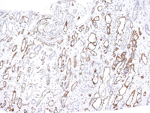 Formalin-fixed, paraffin-embedded human kidney transplant tissue (10X) stained with Complement 4d MAb (C4D204).
