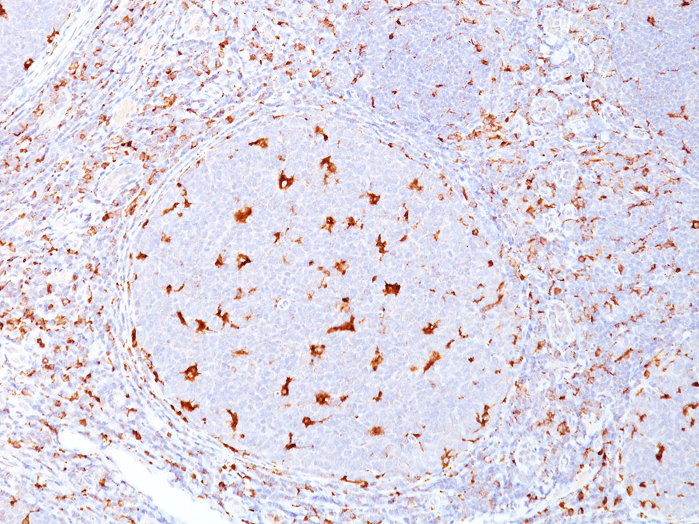 This antibody recognizes a glycoprotein of 110kDa, which is identified as CD68. It is important for identifying macrophages in tissue sections. It stains macrophages in a wide variety of human tissues, including Kupffer cells and macrophages in the red pulp of the spleen, in lamina propria of the gut, in lung alveoli, and in bone marrow. It reacts with myeloid precursors and peripheral blood granulocytes. It also reacts with plasmacytoid T cells, which are supposed to be of monocyte/macrophage origin. It shows strong granular cytoplasmic staining of chronic and acute myeloid leukemia and also reacts with rare cases of true histiocytic neoplasia. Lymphomas are negative or show few granules.