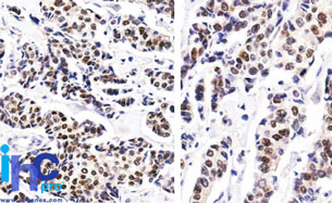 This MAb is specific to ER alpha and shows minimal cross-reaction with other members of the family. ER is an important regulator of growth and differentiation in the mammary gland. Presence of ER in breast tumors indicates an increased likelihood of response to anti-estrogen (e.g. tamoxifen) therapy. It strongly stains nuclei of epithelial cells in breast carcinomas.