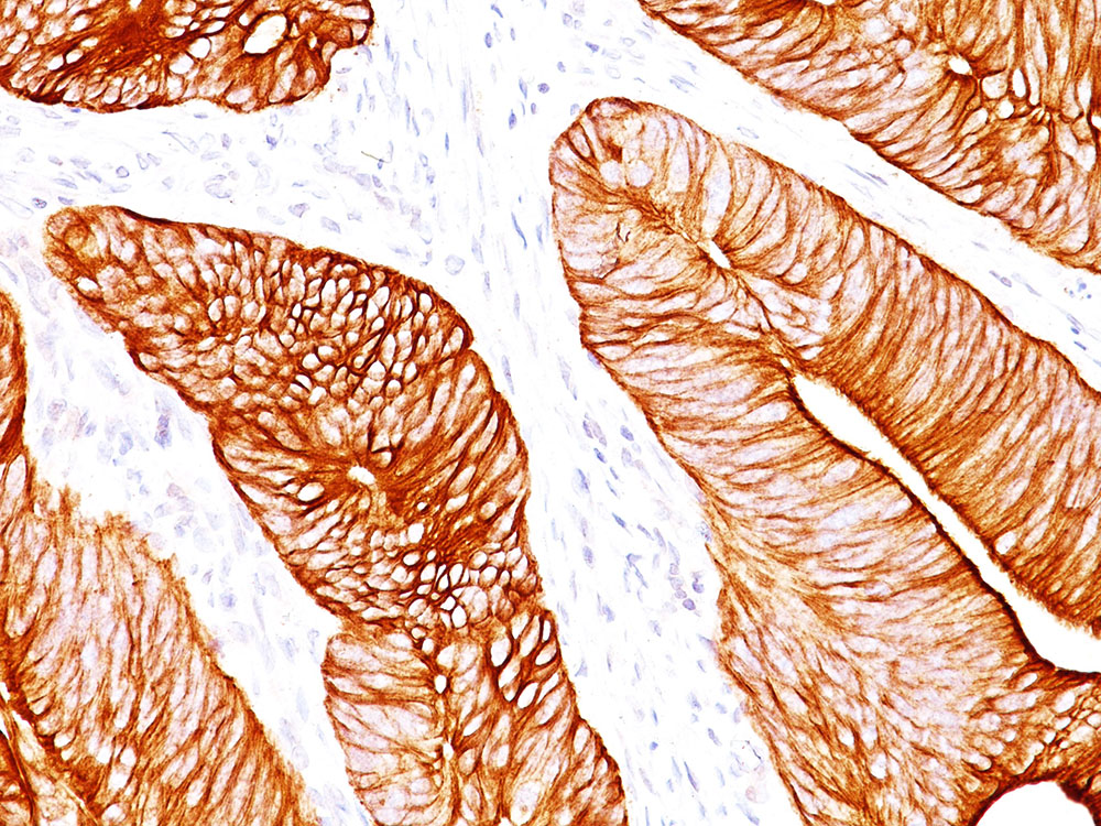 Cytokeratin 8 (CK8) belongs to the type II (or B or basic) subfamily of high molecular weight cytokeratins and exists in combination with cytokeratin 18 (CK18). CK8 is primarily found in the non-squamous epithelia and is present in majority of adenocarcinomas and ductal carcinomas. It is absent in squamous cell carcinomas. Hepatocellular carcinomas are defined by the use of antibodies that recognize only cytokeratin 8 and 18. CK8 exists on several types of normal and neoplastic epithelia, including many ductal and glandular epithelia such as colon, stomach, small intestine, trachea, and esophagus as well as in transitional epithelium. Anti-CK8 does not react with skeletal muscle or nerve cells. Epithelioid sarcoma, chordoma, and adamantinoma show strong positivity corresponding to that of simple epithelia (with antibodies against CK8, CK18 and CK19). Reportedly, anti-CK8 is useful for the differentiation of lobular (“ring-like, perinuclear”) from ductal (“peripheral-predominant”) carcinoma of the breast.