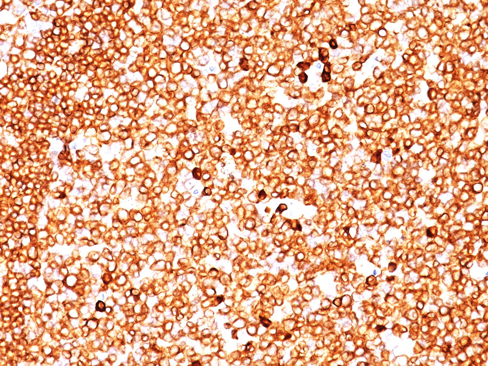 A disulphide-linked heterodimer, consisting of mb-1 (or CD79a) and B29 (or CD79b) polypeptides, is non-covalently associated with membrane-bound immunoglobulins on B cells. This complex of mb-1 and B29 polypeptides and immunoglobulin constitute the B cell Ag receptor. CD79a first appears at pre B cell stage, early in maturation, and persists until the plasma cell stage where it is found as an intracellular component. CD79a is found in the majority of acute leukemias of precursor B cell type, in B cell lines, B cell lymphomas, and in some myelomas. It is not present in myeloid or T cell lines. Anti-CD79a is generally used to complement anti-CD20 especially for mature B-cell lymphomas after treatment with Rituximab (anti-CD20). This antibody will stain many of the same lymphomas as anti-CD20, but also is more likely to stain B-lymphoblastic lymphoma/leukemia than is anti-CD20. Anti-CD79a also stains more cases of plasma cell myeloma and occasionally some types of endothelial cells as well.