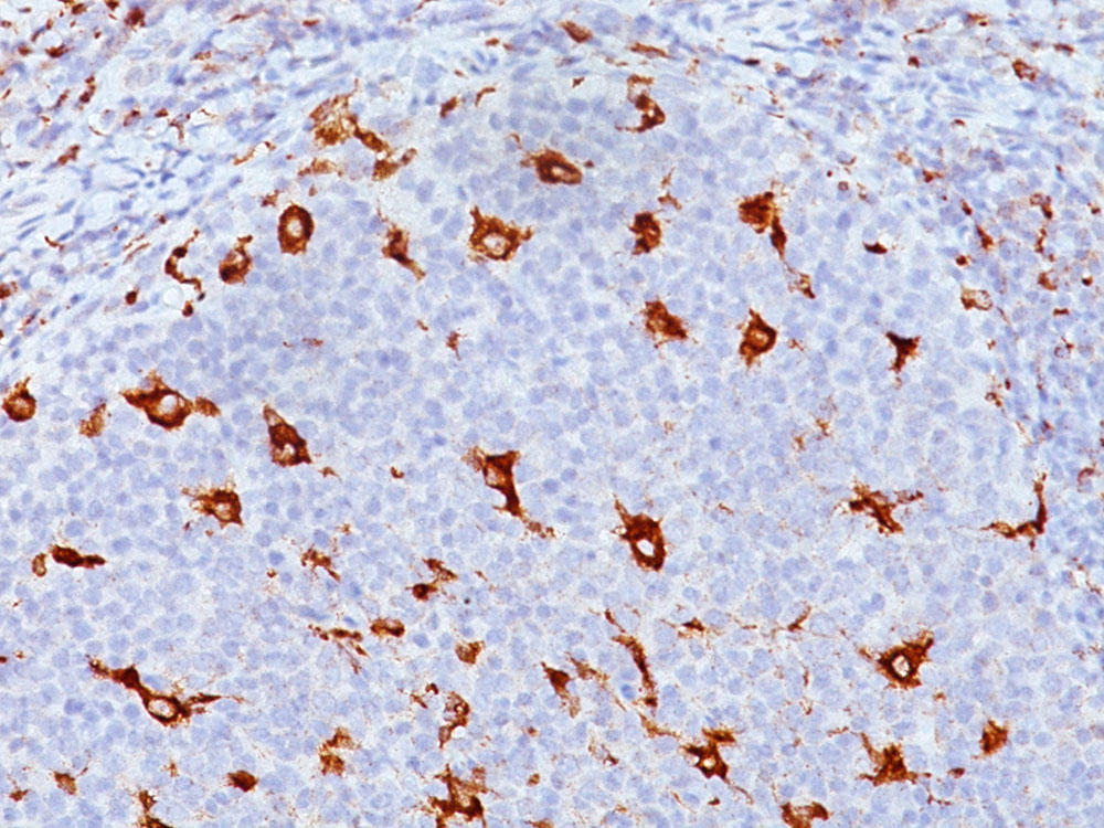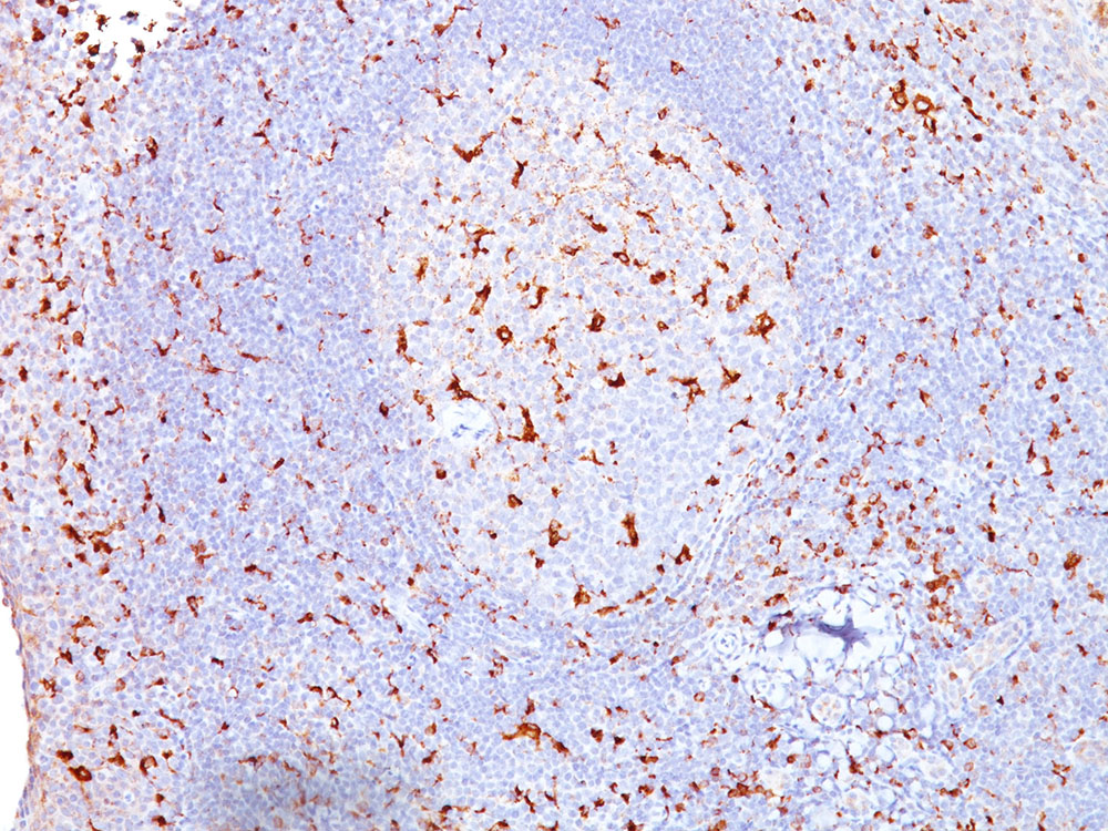 This antibody recognizes a glycoprotein of 110kDa, which is identified as CD68. It is important for identifying macrophages in tissue sections. It stains macrophages in a wide variety of human tissues, including Kupffer cells and macrophages in the red pulp of the spleen, in lamina propria of the gut, in lung alveoli, and in bone marrow. It reacts with myeloid precursors and peripheral blood granulocytes. It also reacts with plasmacytoid T cells, which are supposed to be of monocyte/macrophage origin. It shows strong granular cytoplasmic staining of chronic and acute myeloid leukemia and also reacts with rare cases of true histiocytic neoplasia. Lymphomas are negative or show few granules.