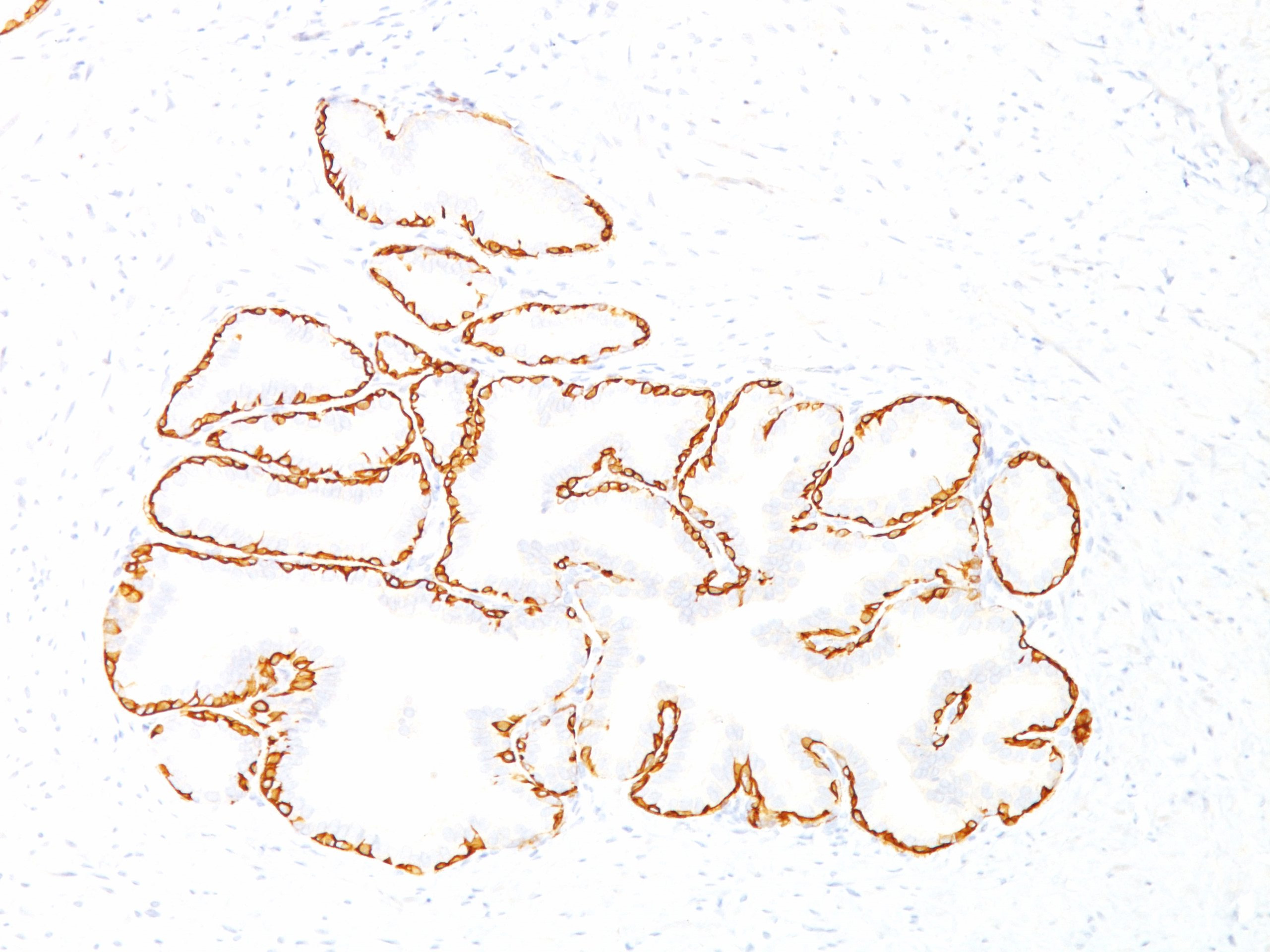 Cytokeratin 14 (CK14) belongs to the type I (or A or acidic) subfamily of low molecular weight keratins and exists in combination with keratin 5 (type II or B or basic). CK14 is found in basal cells of squamous epithelia, some glandular epithelia, myoepithelium, and mesothelial cells. Anti-CK14 is useful in differentiating squamous cell carcinomas from poorly differentiated epithelial tumors. Anti-CK14 is one of the specific basal markers for distinguishing between basal and non-basal subtypes of breast carcinomas. Anti-CK14 is also a good marker for differentiation of intraductal from invasive salivary duct carcinoma by the positive staining of basal cells surrounding the in-situ neoplasm as well as for differentiation of benign prostate from prostate carcinoma. Furthermore, this antibody has been useful in separating oncocytic tumors of the kidney from its renal mimics, and in identifying metaplastic carcinomas of the breast.