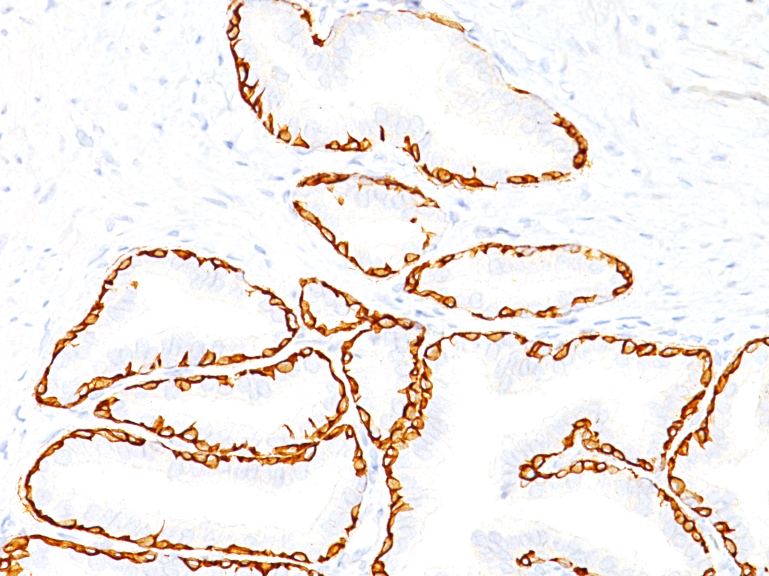 Formalin-fixed, paraffin-embedded human prostate (10X) stained with Cytokeratin 14 MAb (LL002).