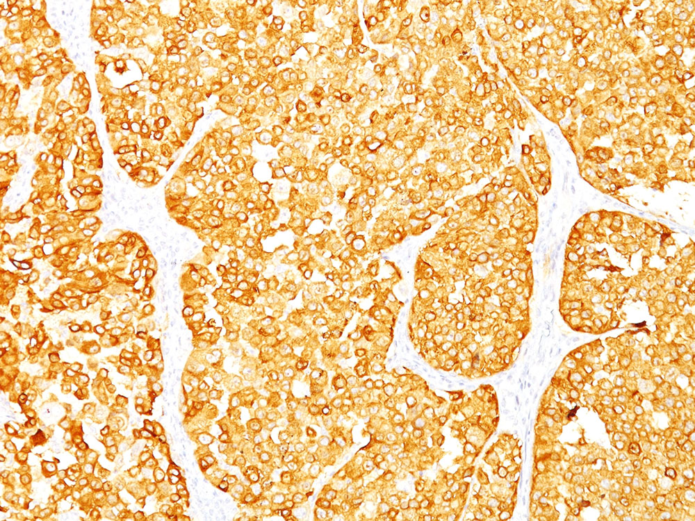 Formalin-fixed, paraffin-embedded human melanoma stained withMelan-A MAb (M2-7C10+M2-9E3). Note cytoplasmic staining of cells. |