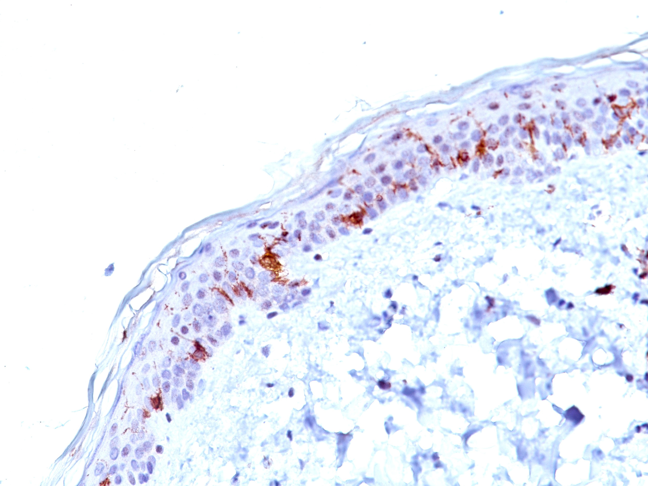 Formalin-fixed, paraffin-embedded human human skin stained with CD1a MAb (O10). |