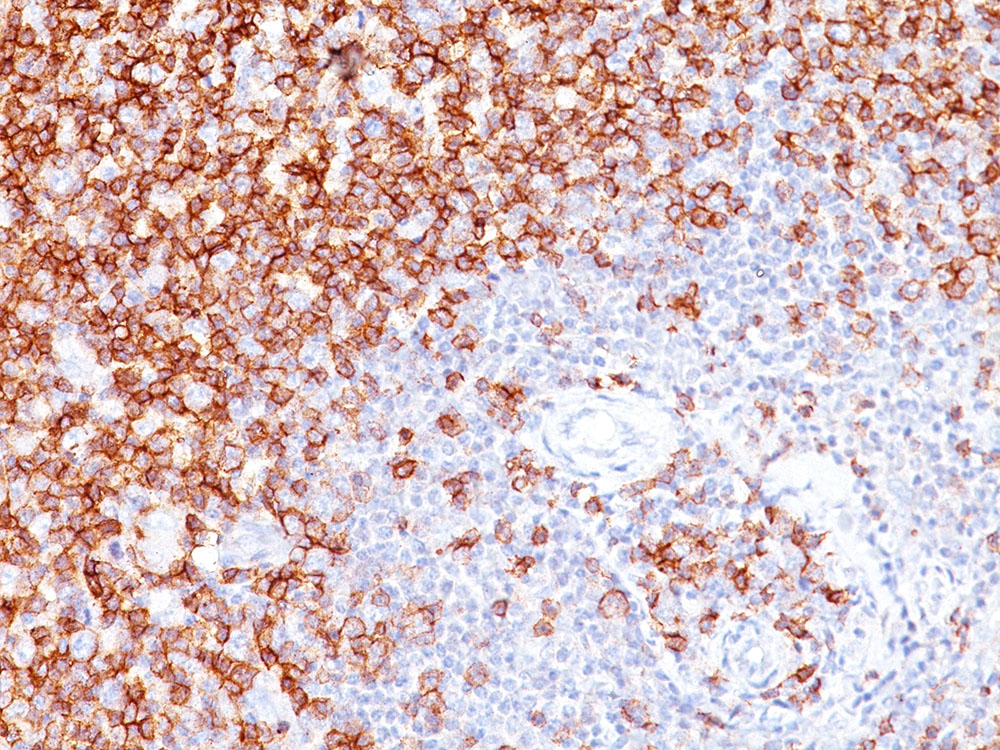 Formalin-paraffin human tonsil stained with CD45RO Ab (UCHL-1).
