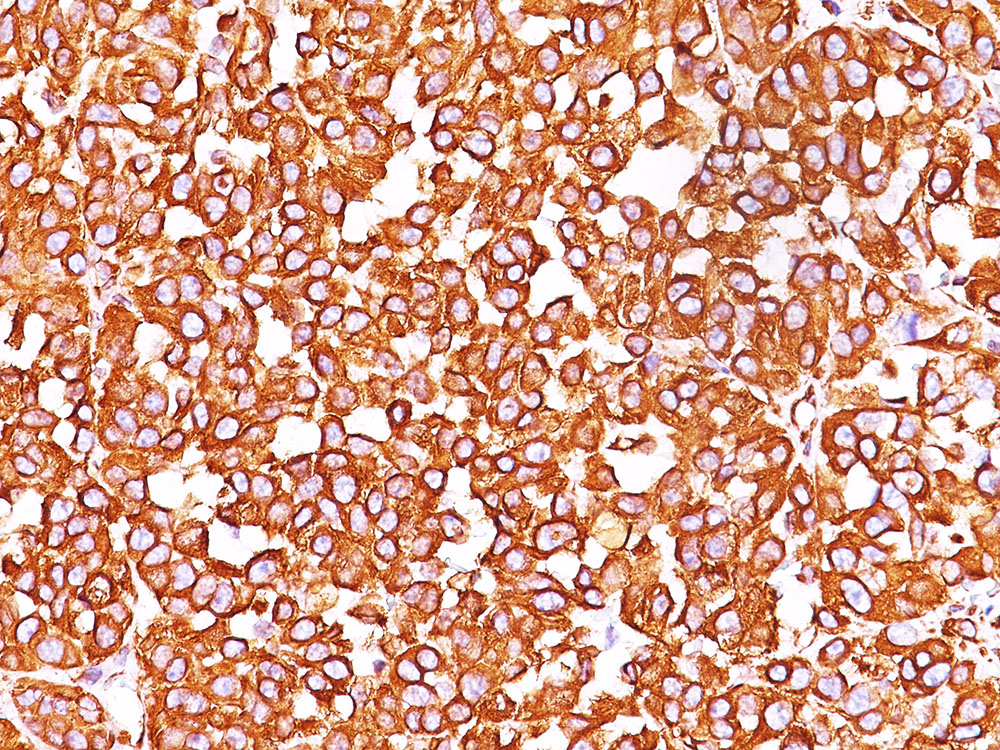 This MAb reacts with a 58kDa protein identified as vimentin. It shows no cross-reaction with other closely related intermediate filament proteins (IFP’s) such as desmin, keratin, neurofilament, and glial fibrillary acid protein. Anti-vimentin alone is of limited value as a diagnostic tool; however, when used in panels with other antibodies, it is useful for the sub-classification of a given tumor. Expression of vimentin, when used in conjunction with anti-keratin, is helpful when distinguishing melanomas from undifferentiated carcinomas and large cell lymphomas. All melanomas and Schwannomas react strongly with anti-vimentin. It labels a variety of mesenchymal cells, including melanocytes, lymphocytes, endothelial cells, and fibroblasts. Non-reactivity of anti-vimentin is often considered more useful than its positive reactivity, since there are a few tumors that do not contain vimentin, e.g. hepatoma and seminoma. Anti-vimentin is also useful as a tissue process control reagent.