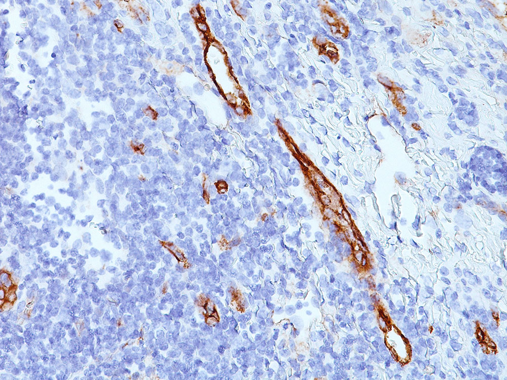 von Willebrand Factor (vWF) is a multimeric glycoprotein that is found in endothelial cells, plasma and platelets. It acts as a carrier protein for Factor VIII and promotes platelet adhesion and aggregation. vWF undergoes a variety of posttranslational modifications that influence the affinity and availability for Factor VIII, including cleavage of the propeptide and formation of N-terminal disulfide bonds. This antibody helps to establish the endothelial nature of some lesions of disputed histogenesis, e.g. Kaposi’s sarcoma and cardiac myxoma. It is widely used for differentiating vascular lesions from those of other tissue differentiation within a panel of other vascular markers although not all tumors of endothelial differentiation contain this antigen.