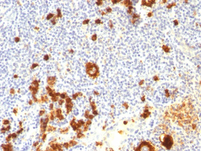 Formalin-fixed, paraffin-embedded human Hodgkin's Lymphoma stained with CD15 Monoclonal Antibody (FUT4/815 + BRA-4F1). |
