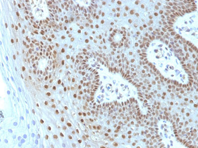 It recognizes a transcription factor of 64-67kDa, identified as c-myc. This MAb shows no cross-reaction with v-myc. c-myc is involved in the control of cell proliferation and differentiation and is amplified and/or over-expressed in a variety of tumors. Over-expression of c-myc protein occurs frequently in luminal cells of prostate intraepithelial neoplasia as well as in most primary carcinomas and metastatic disease. Rearrangement of the MYC gene is found in 3% to 16% of diffuse large B-cell lymphoma (DLBCL s) and in nearly 100% of Burkitt lymphomas (BL). Identifying MYC status is important in establishing final diagnosis of DLBCL, BL, or B-cell lymphoma, with features intermediate between DLBCL and BL as well as in differential diagnoses of the lymphomas.