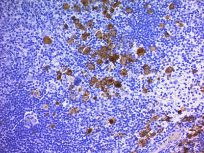 Formalin-fixed, paraffin-embedded human Hodgkin's Lymphoma stained with CD30 Monoclonal Antibody (Ber-H2 + CD30/412). |