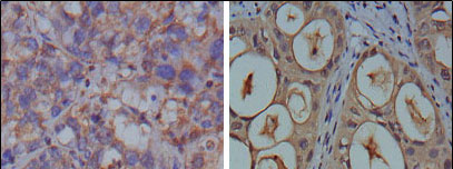Figure 2: Immunohistochemical analysis of paraffin-embedded human breast carcinoma (left) and kidney carcinoma (right), showing cytoplasmic localization using GAPDH mouse mAb with DAB staining.