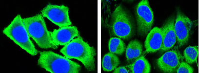 Figure 3: Confocal immunofluorescence analysis of methanol-fixed HepG2 (left) and Hela (right) cells using GAPDH mouse mAb (green), showing cytoplasmic localization. Blue: DRAQ5 fluorescent DNA dye. |