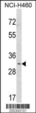 Western blot analysis of SNAI (Cat. AMM02331G) in NCI-H460 cell line lysates (35μg/lane). SNAI (arrow) was detected using the ascites. |
