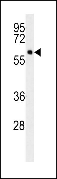 Western blot analysis of SPA9 Antibody (N-term) (Cat. AMM02333G) in Ramos cell line lysates (35μg/lane). SPA9 (arrow) was detected using the Mab ascites (1:1000 dilution).