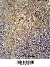 SPA9 Antibody (N-term) (Cat. AMM02333G) immunohistochemistry analysis in formalin fixed and paraffin embedded human tonsil tissue followed by peroxidase conjμgation of the secondary antibody and DAB staining. This data demonstrates the use of the SPA9 Antibody (N-term) for immunohistochemistry. Clinical relevance has not been evaluated. |