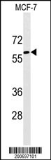alpha 1 Fetoprotein Monoclonal Antibody (N-term) (Cat. AMM02335G) western blot analysis in MCF-7 cell line lysates (35μg/lane).This demonstrates the alpha 1 Fetoprotein antibody detected the alpha 1 Fetoprotein protein (arrow).(16μg/ml) |