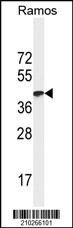 Western blot analysis of HLA-A Antibody (Cat. AMM02338G) in Ramos cell line lysates (35μg/lane).HLA-A (arrow) was detected using the purified Mab.(1:500) |