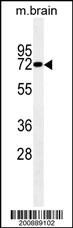 LIMK1 Antibody (C-term) (Cat. AMM02340G) western blot analysis in mouse brain tissue lysates (35μg/lane).This demonstrates the LIMK1 antibody detected the LIMK1 protein (arrow). |