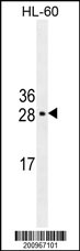 UBTD1 (Cat. AMM02345G) western blot analysis in HL-60 cell line lysates (35μg/lane).This demonstrates the UBTD1 antibody detected the UBTD1 protein (arrow). |