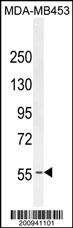 ESR1 antibody (Cat. AMM02350G) western blot analysis in MDA-MB453 cell line lysates (35μg/lane).This demonstrates the ESR1 antibody detected the ESR1 protein (arrow). |