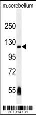 NLRP12 antibody (Cat. AMM02353G) western blot analysis in mouse cerebellum tissue lysates (35μg/lane).This demonstrates the NLRP12 antibody detected the NLRP12 protein (arrow). |