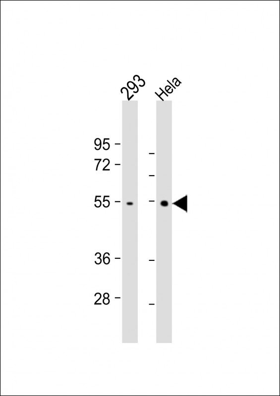 All lanes : Anti- at 1:1000 dilution Lane 1: 293 whole cell lysate Lane 2: Hela whole cell lysate Lysates/proteins at 20 μg per lane. Secondary Goat Anti-mouse IgG, (H+L), Peroxidase conjugated at 1/10000 dilution. Predicted band size : 56 kDa Blocking/Dilution buffer: 5% NFDM/TBST.