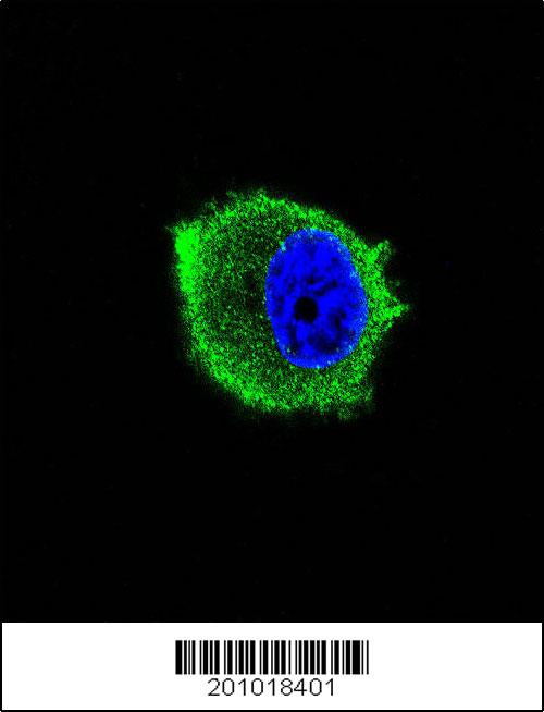 Confocal immunofluorescent analysis of TRAF2 Antibody ( AMM02354G) with MCF-7 cell followed by Alexa Fluor? 488-conjugated goat anti-mouse lgG (green). DAPI was used to stain the cell nuclear (blue).