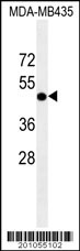 DPF2 antibody (Cat. AMM02355G) western blot analysis in MDA-MB435 cell line lysates (35μg/lane).This demonstrates the DPF2 antibody detected the DPF2 protein (arrow).