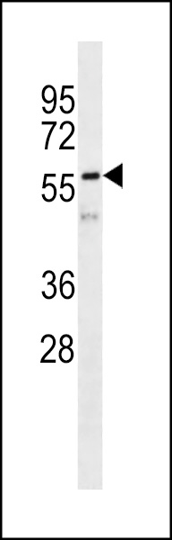 VIME Antibody (Cat. AMM02362G) western blot analysis in Hela cell line lysates (35μg/lane).This demonstrates the VIME antibody detected the VIME protein (arrow). |